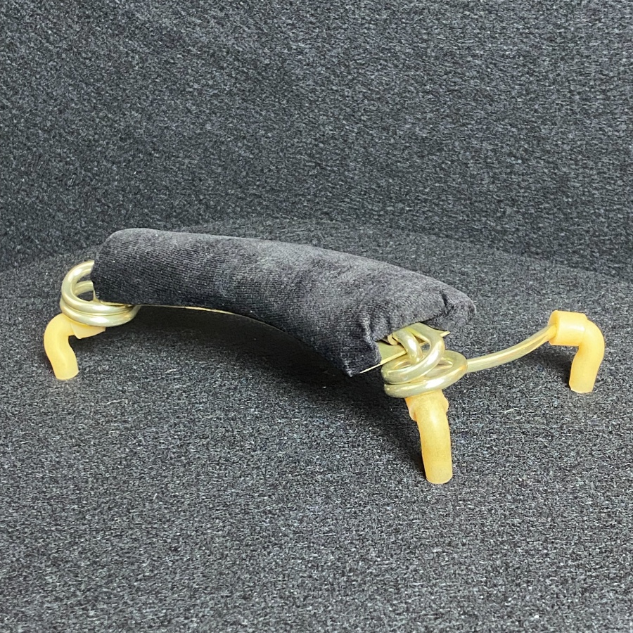 Shar brand shoulder rest made of brass with spring fit rubber-tipped feet. Pad is covered with black felt. Two sizes available 1/2 & 4/4-3/4